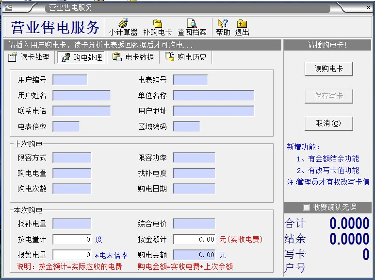 3、電表第一次使用,電表里有20度預(yù)置電量,是不能用完,要馬上給用戶開(kāi)戶,插IC卡使用,第二次是沒(méi)關(guān)系的,用完了再?zèng)_也是可以的。